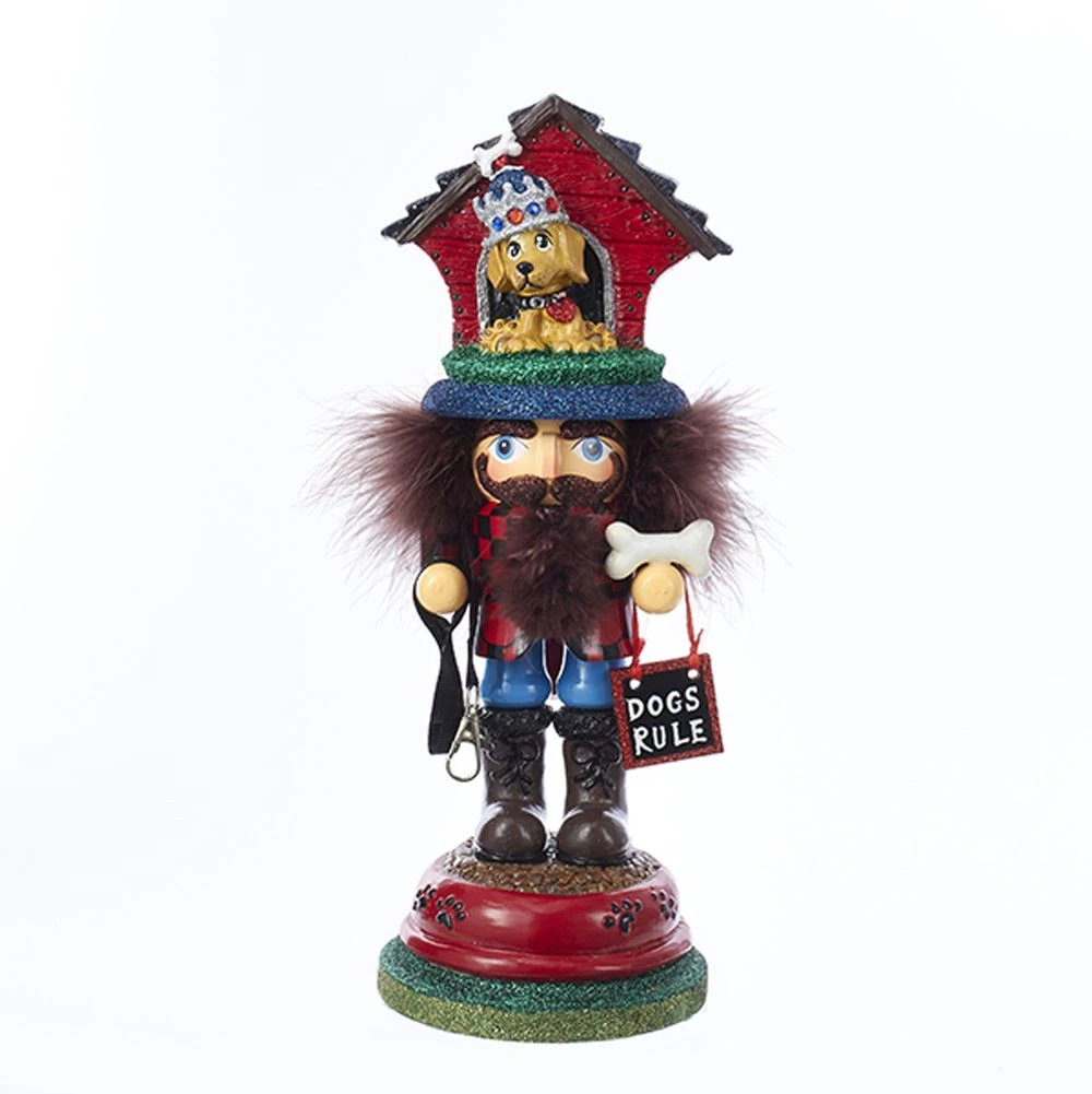 Designed by renowned artist Holly Adler, Hollywood Nutcrackers are a whimsical collection of nutcrackers created exclusively. This 13-inch Hollywood doghouse Hat Nutcracker is a fun and festive addition to any holiday decor or nutcracker collection. Perfect for dog lovers, this piece is holding a leash, a bone, and a Dogs Rule sign. Standing on a dog food bowl, this piece is topped with a red doghouse and a small dog wearing a silver crown.